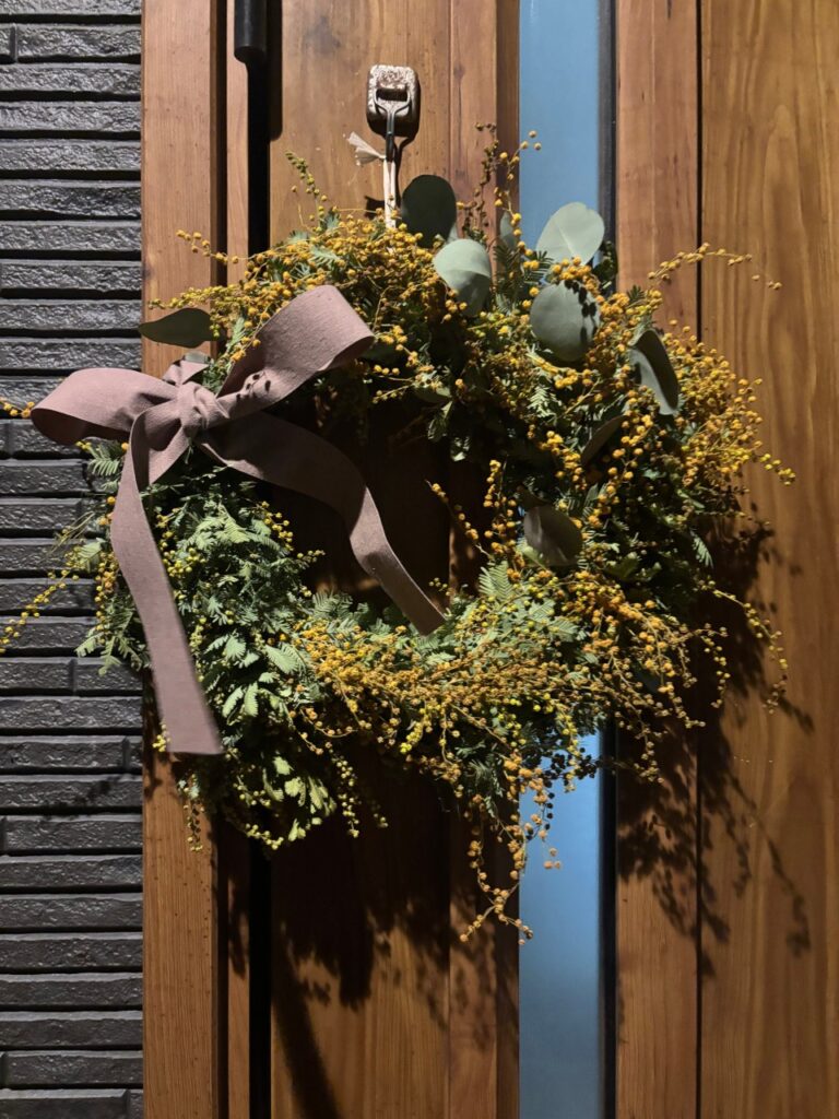 ミモザのリース、我が家の玄関に彩りと柔らかな香りを添えてくれています。